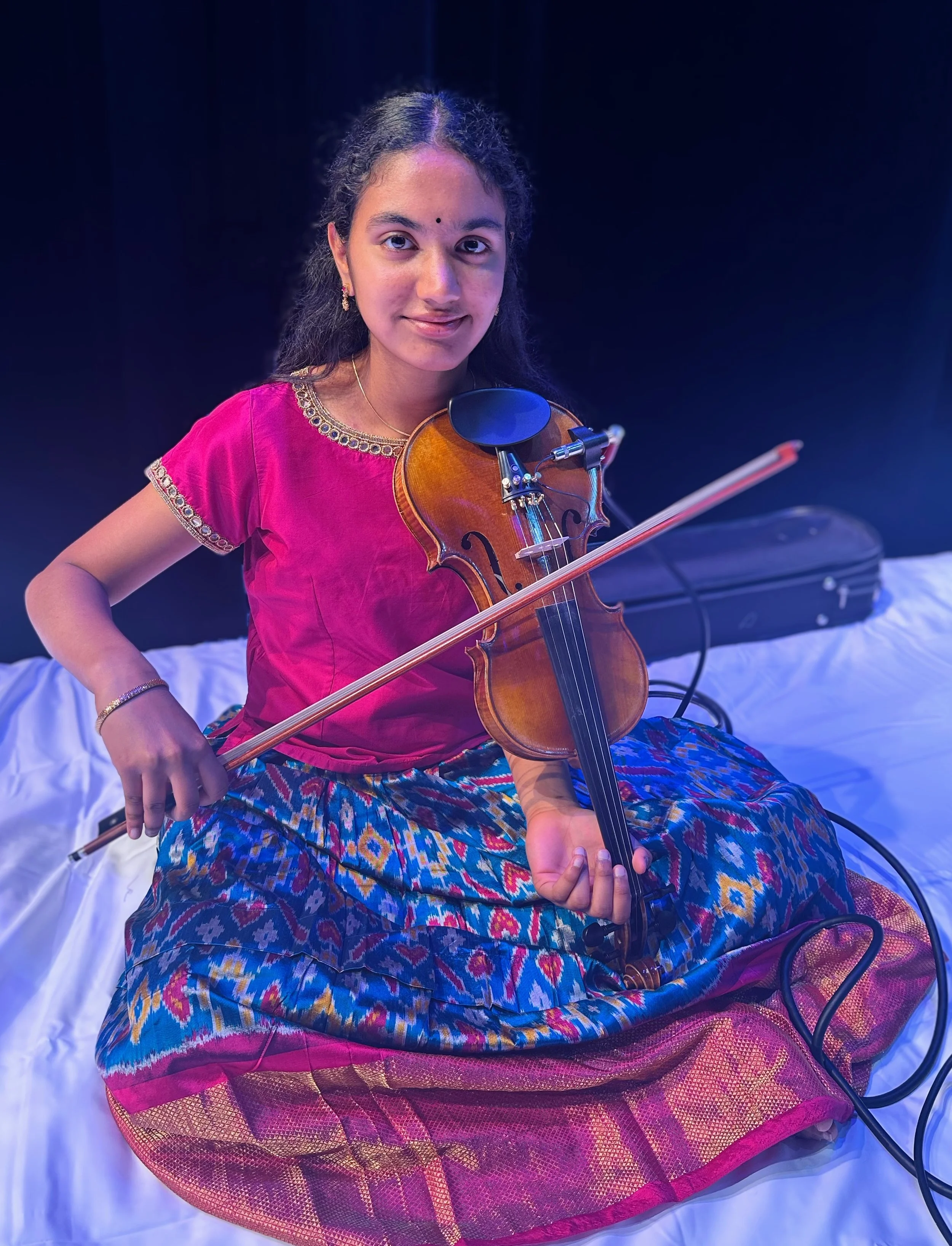 Amatra Jagannathan, a 14-year-old musician, began learning Carnatic violin at age 8 under the guidance of Grammy Award winner Sri Ganesh Rajagopalan. She performed her violin arangetram at age 12 and has since showcased her talent extensively in both Carnatic and Western classical violin as a soloist and accompanist. Amatra also trains in Western classical violin for the Seattle Youth Symphony Orchestra and the Evergreen Philharmonic. In addition to her vocal training with her guru, she has collaborated on various dance and percussion projects and has been part of live orchestras for shows and arangetrams.
